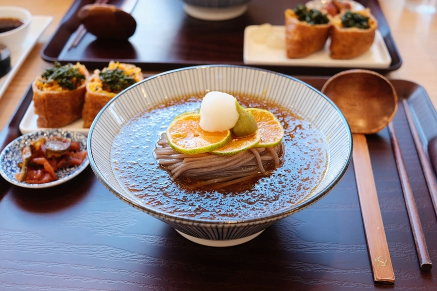 비건 옵션이 있는 식당을 찾아 점심을 해결했다. 도토리 키친은 청귤 소바가 유명한 국숫집인데 청귤 국수와 유부초밥을 비건으로 주문할 수 있다. 워낙 인기 있는 식당이라 문 앞에는 줄이 길게 늘어섰다. 평소에는 줄이 있으면 다른 식당으로 가는 우리지만 제주에 온 만큼 기다리기로 했다. 딱히 다른 채식 옵션이 없어서이기도 했다. 국수는 상쾌하고 맛있다. 제주의 뙤약볕을 잠시 식혀주는 시원함이었다.