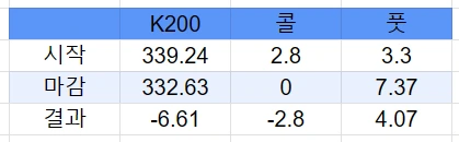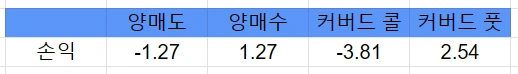 커버드풋 손익 = 시작일 선물가격 - 마감일 선물가격 + 시작일 풋옵션 가격 - 마감일 풋옵션 가격