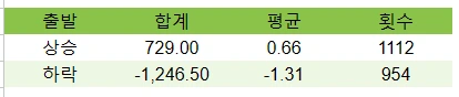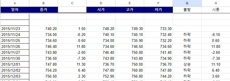 조건 확인: if 문을 사용하여 개장 가격이 전일 종가보다 높으면 "상승"으로, 낮으면 "하락"으로 분류합니다.