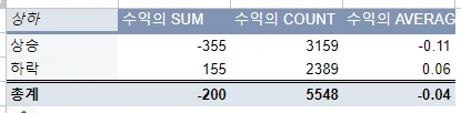 시초가가 하락 출발할 때 음봉이 될 확률이 높을 것이라 예상할 수 있습니다. 2389번의 하락출발의 누적값은 플러스였습니다. 2389번의 하락출발의 누적값은 플러스였습니다. 하락추세로 결과가 나왔습니다.