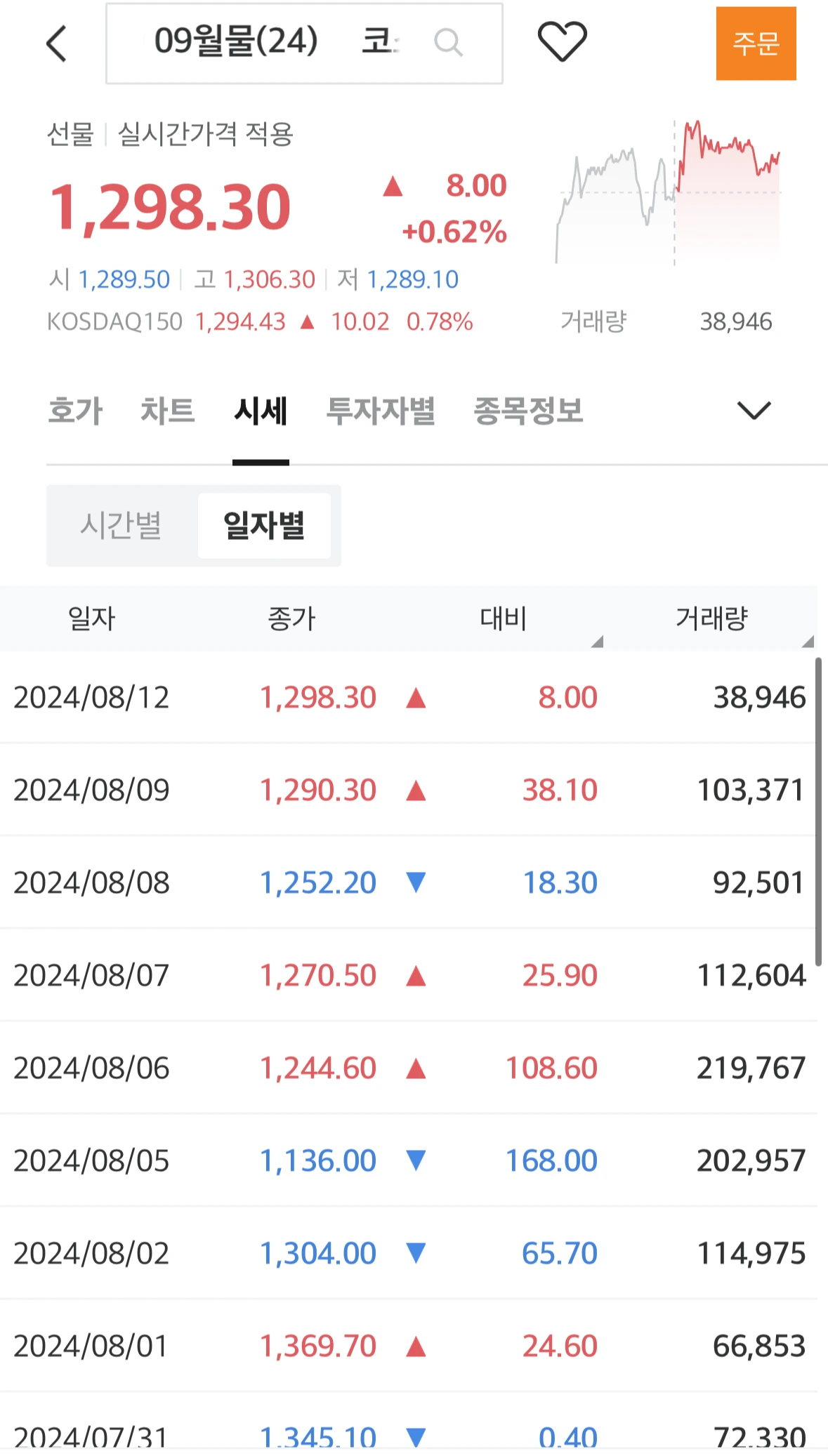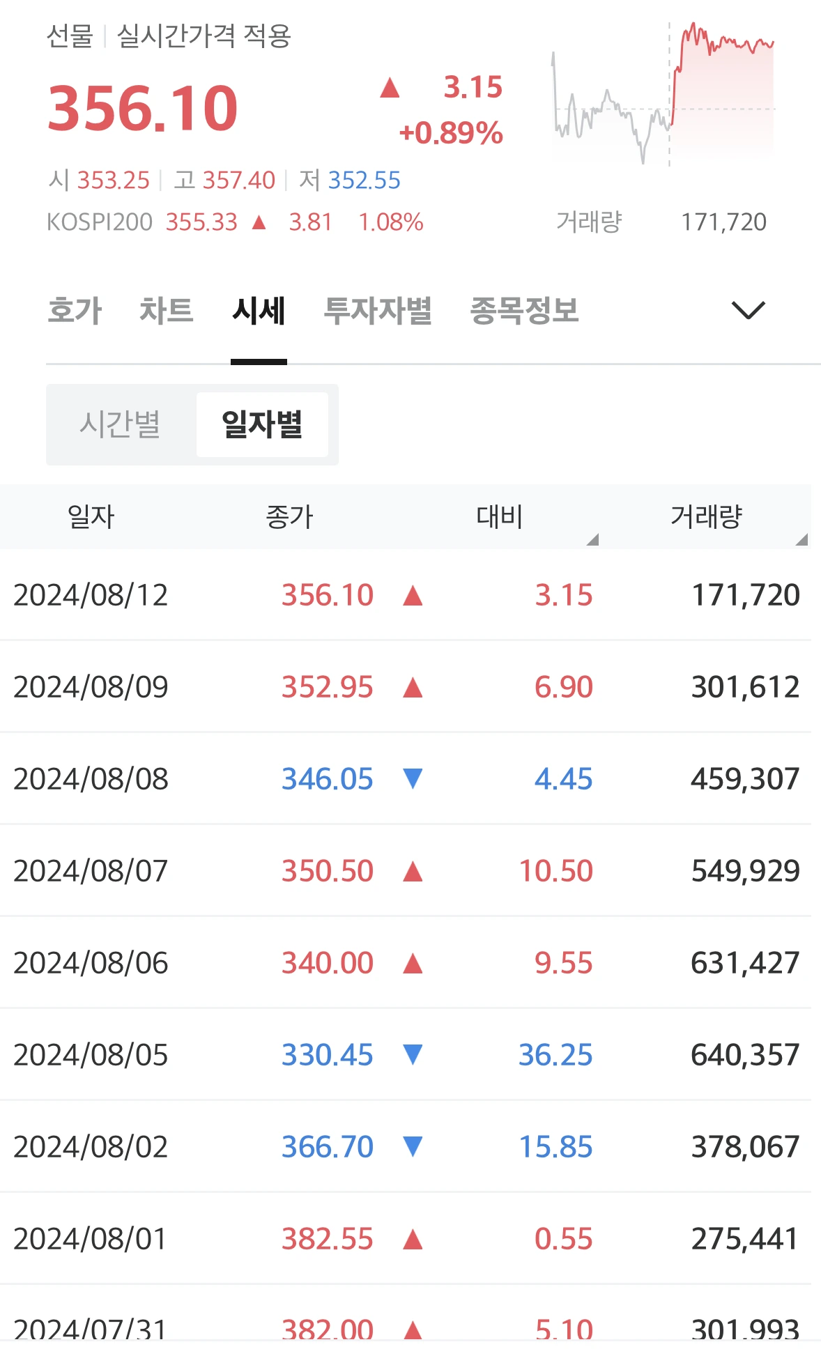 코스피200 선물은 코스피 시장의 대표 종목 200개를 지수화한 상품입니다. 대표적인 대형주들이 포함되어 있어 거래량도 활발하며, 시장의 움직임도 상대적으로 안정적입니다. 예를 들어, 2024년 8월 12일 코스피200 선물의 거래량은 낮 1시 기준으로 17만 건이 넘었고, 거래 규모는 15조 원에 달했습니다. 반면, 코스닥150 선물은 같은 시간에 4만 건도 채 되지 않았고, 거래 규모는 5천억 원에 불과했습니다. 이는 코스피200이 코스닥150보다 훨씬 더 활성화된 시장이라는 것을 보여줍니다.