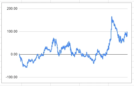 제가 5일 이평선 매매를 기반으로 만든 수식에 따르면, 지난 24년 동안 누적 수익은 79점이 나왔습니다. 실거래에 적용하기에는 다소 부족한 성과라고 할 수 있습니다. 다만, 이 방법을 계속해서 다듬고 다른 전략과 결합한다면 더 나은 결과를 기대할 수 있을 것입니다.