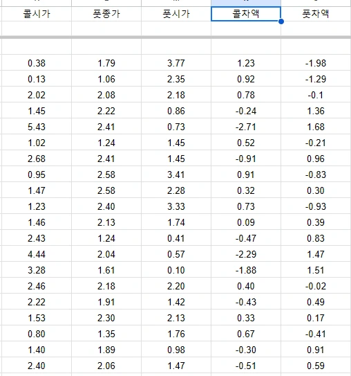 먼저 동일한 행사가격의 콜옵션과 풋옵션 가격을 입력하고, 두 가격의 차이를 계산했습니다. 양매도는 기본적으로 이 차이를 이용해 수익을 추구하는 전략입니다.