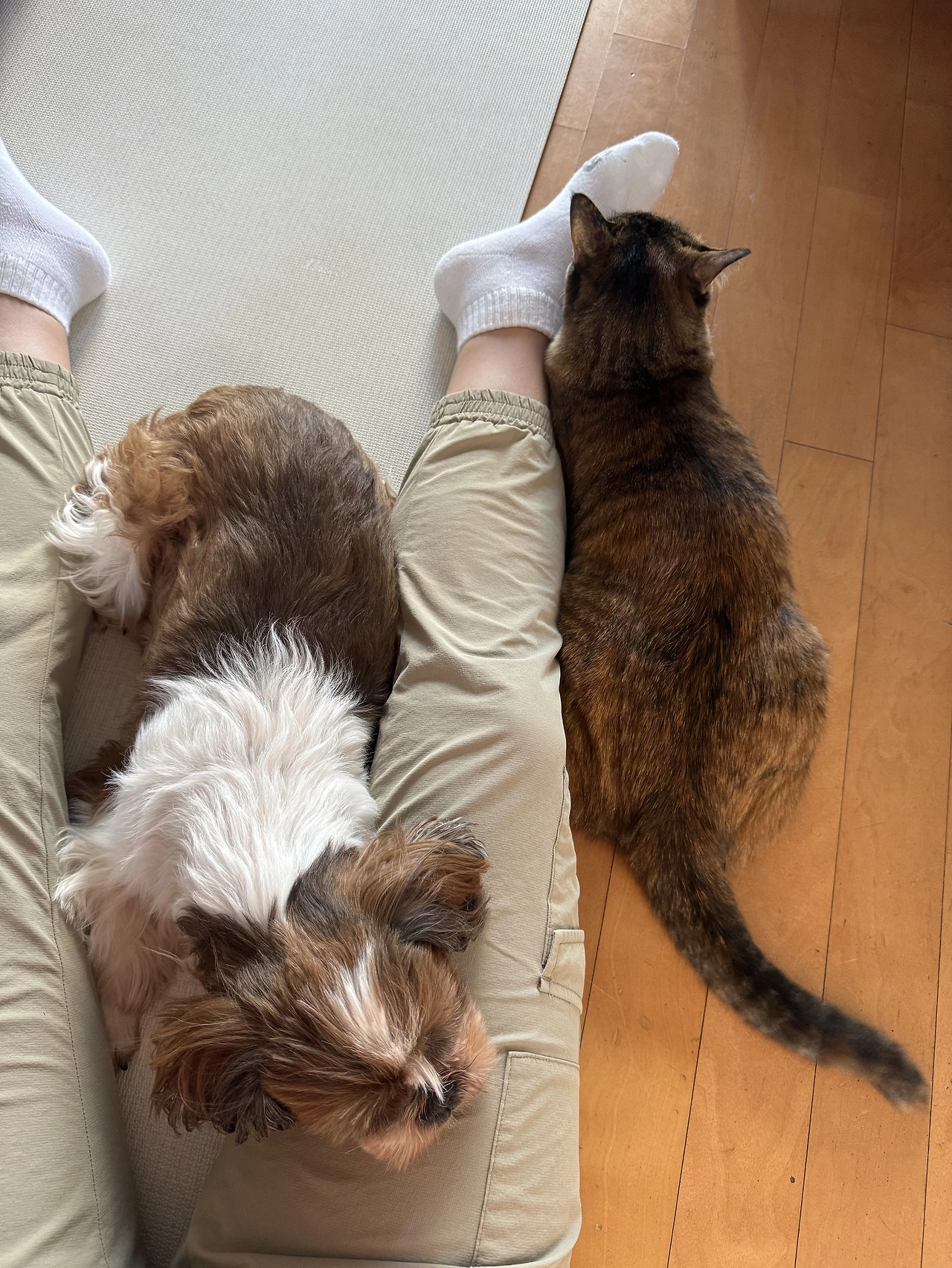 그러다 단풍이가 한창 쑥쑥 자라던 7~8개월령 때쯤부터 단풍이를 향한 타니의 짜증이 잦아졌다. 어제는 단풍이에게 먼저 놀자고 폴짝폴짝 뛰었다 엎드렸다 해 놓고, 오늘은 솜방망이를 날리며 장난을 거는 단풍이에게 버럭 성질을 내는 식이었다. 뻗치는 에너지로 사방천지를 쑤시고 다니던 단풍이는 갑자기 달라진 강아지 오빠의 태도에 당황해 눈치를 보기 시작했다. 보호자인 우리도 타니가 언제 단풍이를 예뻐할지, 그러다 또 언제 돌변해서 화를 낼지 몰라 신경이 쓰이긴 마찬가지였다.