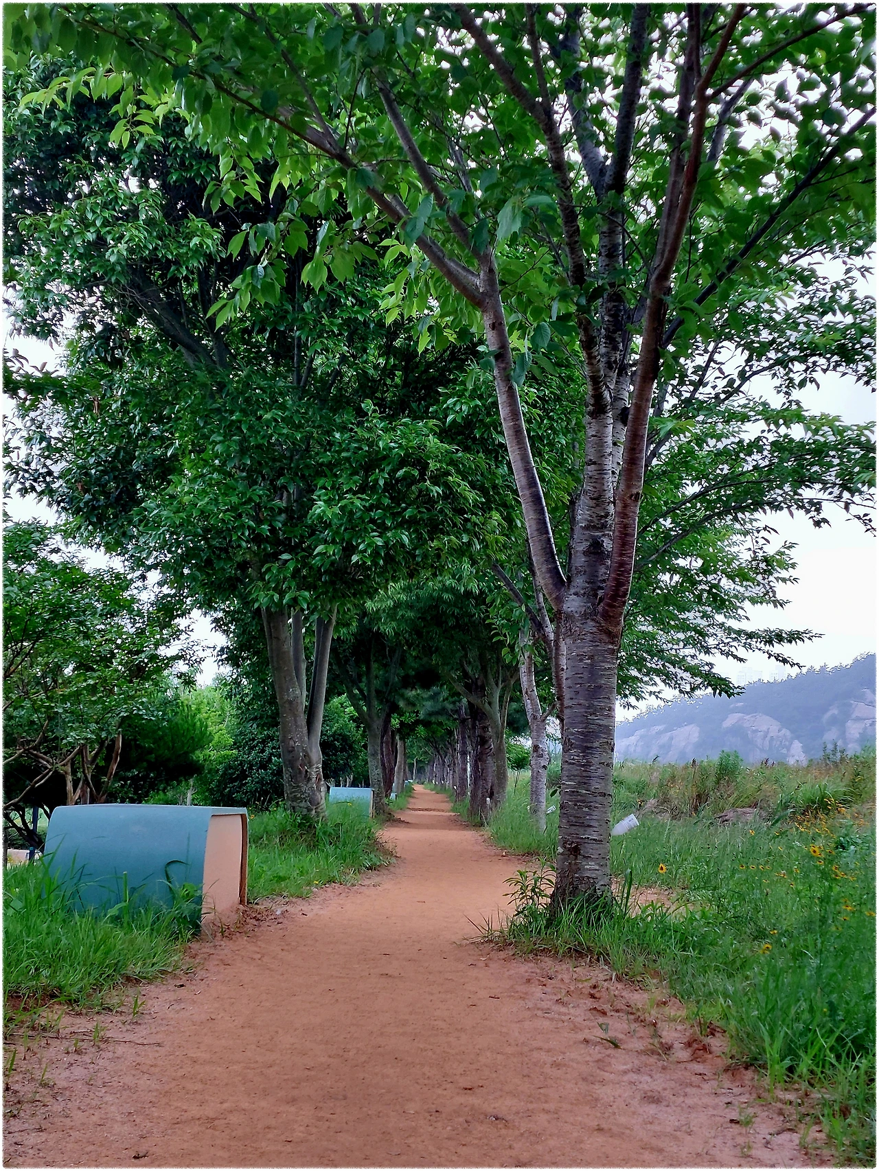 맨 발길에 도착하면 슬리퍼를 벤치 옆에 얌전히 벗어 놓고 멀리 보이는 길 끝을 한번 바라본다.