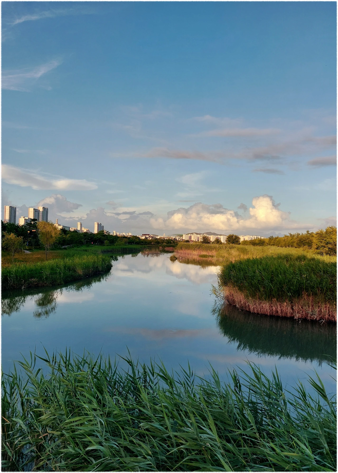 그런데 딱하게도 이렇듯 싱그러운 초목과 형형색색의 꽃을 보며 아름다운 자연 속을 거닐지만 내 속은 싱그럽지도 아름답지도 못할 때가 많았다. 갱년기 탓인지 외롭고 서러운 이런저런 일들을 떠올렸고, 불안하고 억울한 감정들을 곱씹으며 한 발 한 발 내디뎠다. 그러다 한 번씩 고개를 돌려 수변을 바라본다. 푸른 갈대가 자라고 있는 넓고 기다란 연못, 바람 따라 흘러가는 잔잔한 물결에 시선이 머문다. 잠시 물멍이다! 복잡한 감정이 사라지고 고요해진다. 차분하고 편안해진다.