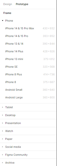 피그마에서는 별도 검색 없이 주요 디바이스 사이즈를 바로 확인/적용 가능하다.