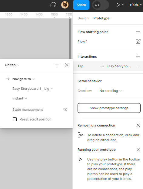 우측 상단의 [Prototype] 탭을 클릭하면 프로토타입 설정이 가능하다.