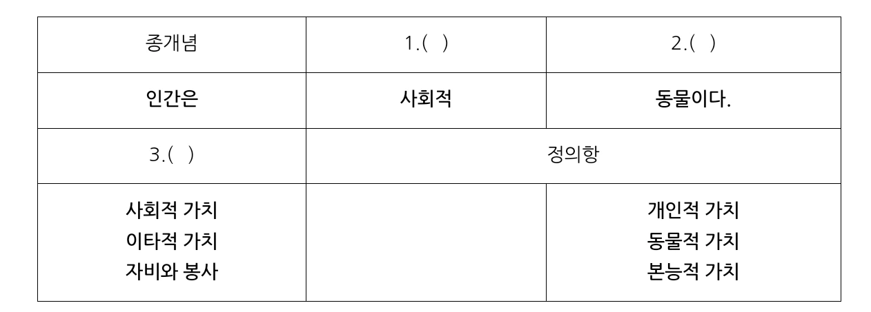 이렇게 하는 근거는 ‘인간은 사회적 동물이다.’는 정의를 바탕으로 한다. 이 정의는, 사회적 가치를 실천할 때는 인간이고, 사회적 가치를 실천하지 않을 때는 동물이라는 말이다. 사회적 가치는 이타적 가치, 자비의 가치와 교체할 수 있을 것이다. 그리고 동물적 가치는 개인적 가치, 본능적 가치와 교체할 수 있을 것이다.
