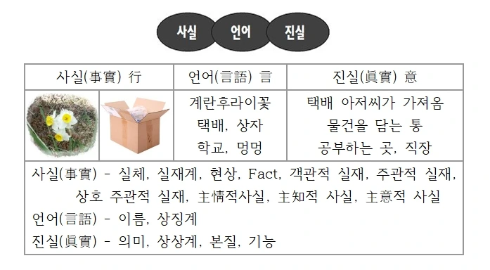 위의 표에서 ‘사실과 언어, 사실과 진실, 언어와 진실’ 등은 사람마다 서로 다르다. 그런데 우리는 서로 같다고 착각하면서 살아간다. 그대의 진리와 나의 진리는 같기도 하고 다르기도 하다는 것을 인정하고 진리탐구를 하면 다툴 일이 줄어들지만 많은 사람들이 자신의 진리를 남에게 강요하고 남의 진리는 인정하지 않는 폭력이 일어난다.