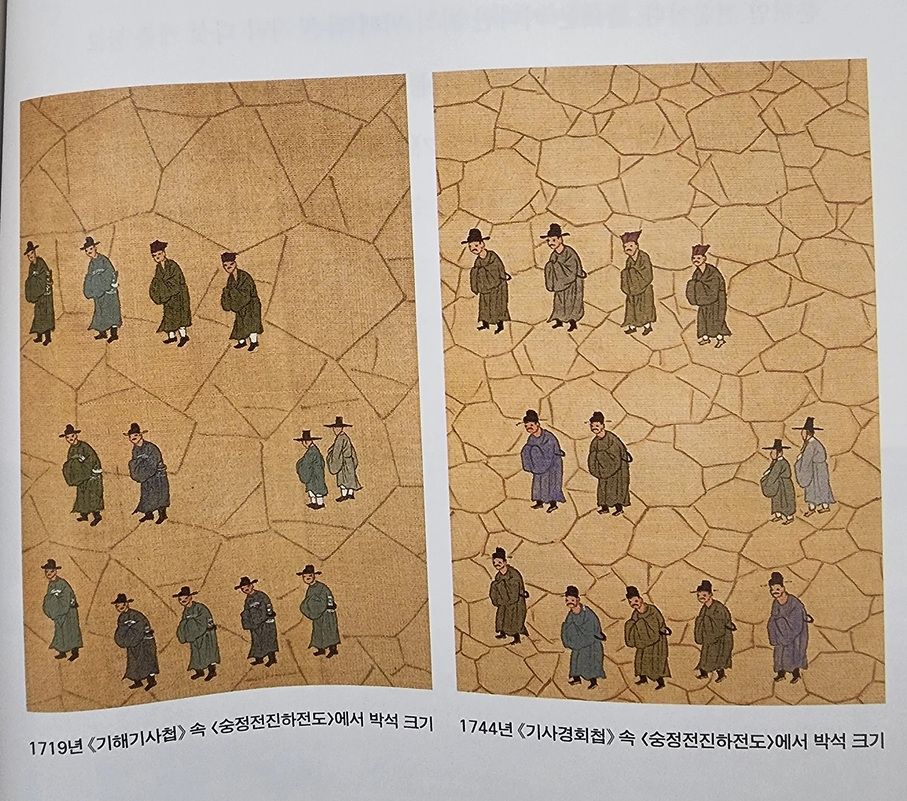 먼저 숭정전 뜰 박석의 경우 <숭정전진하전도>에 나타난 박석의 크기다. <숭정전진하전도>는 숭정전에서 기로신들에게 축하문서를 받은 것을 그림으로 나타낸 것이다. 이때 숙종 임금 때의 박석은 크게 그렸고 영조 임금 때의 박석은 그에 비해 크기가 작다. 이는 박석의 크기가 큰 것이 시각적으로 더 눈에 잘 들어온다는 점을 통해 화원들의 융통성을 나타내었다.