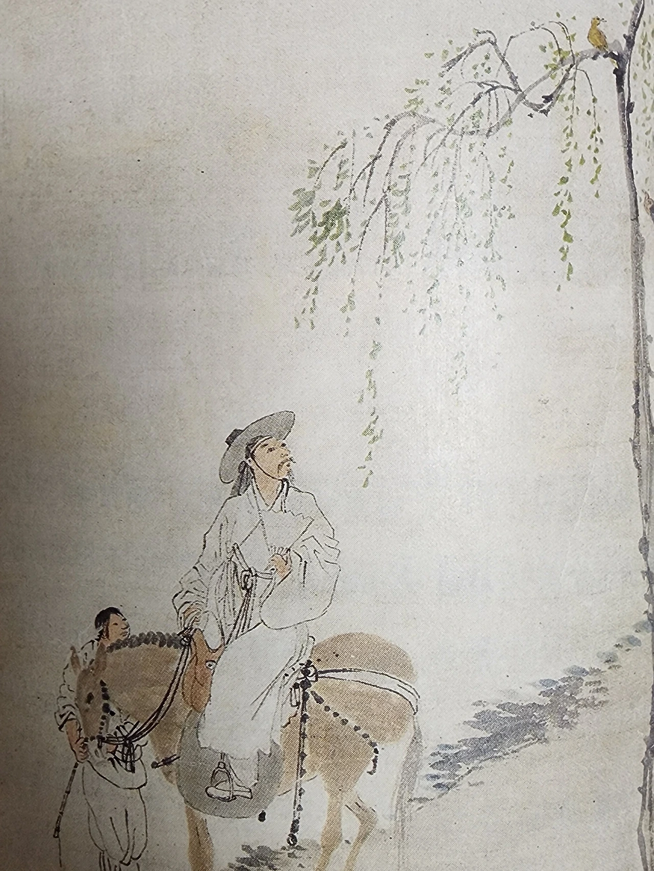 김홍도의 <마상청앵>과 <기우부신>은 무언가를 타고 있는 사람의 묘사에서부터 시작된다. 전자는 말을 타고 가다가 말을 멈춰 세우고 버드나무 가지에 있는 새를 보고 있다. 그림에서도 볼 수 있듯이 매우 여유로운 상황임이 틀림없다. 가던 길을 잠시 멈추고 자연 속 새를 느긋하게 감상하는 모습은 한 선비가 자연 속에서 풍류를 즐기는 모습과 일맥상통한다. 그림 속 선비에게 있어서 말은 그가 이동할 수 있게 해주는 수단이요, 때론 편하게 여유를 부릴 수 있는 안식처이다.