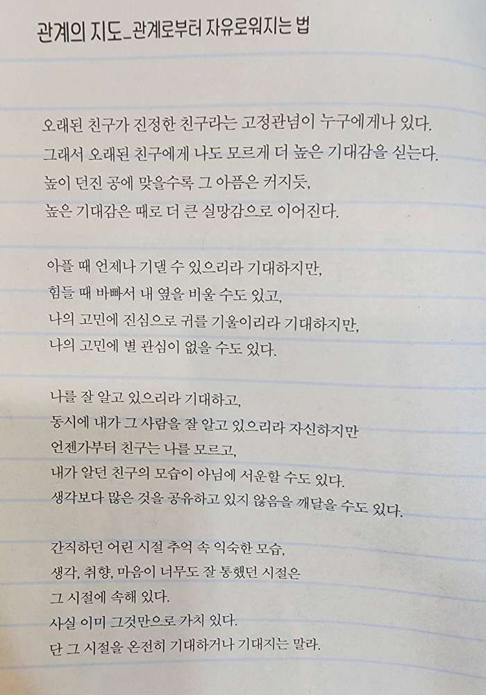 이 책은 이러한 현상을 자연스럽게 받아들이라고 말한다. 생각이나 마음이 잘 통했던 시절은 그 시절일 뿐, 그리고 그 시절을 함께 보냈다는 것 자체만으로 가치 있다. 성장하며 각자의 모습과 취향, 가치관이 달라졌고 오래된 관계도 언제나 변화할 수 있다는 사실을 받아들여야 한다.