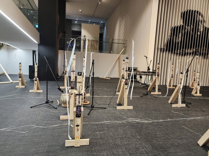 이들은 공연장 안으로 들어와서 곧바로 악기를 연주하지 않는다. 기계를 통해 움직이는 천 하나 하나에 마이크를 갖다 댄다. 여러 천이 움직이는 소리가 처음보다 더 크게 들린다. 그제서야 한 명의 연주자는 대금을 입에 대고, 또 다른 한 명은 작은 북 앞에 앉아 본격적으로 연주를 시작한다.