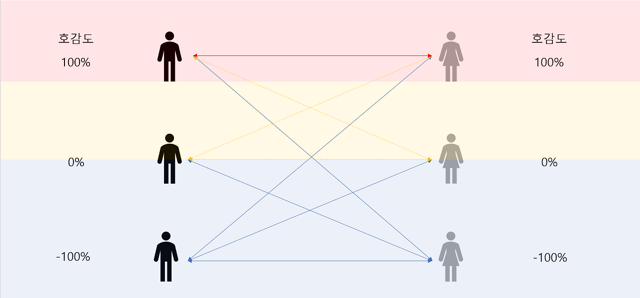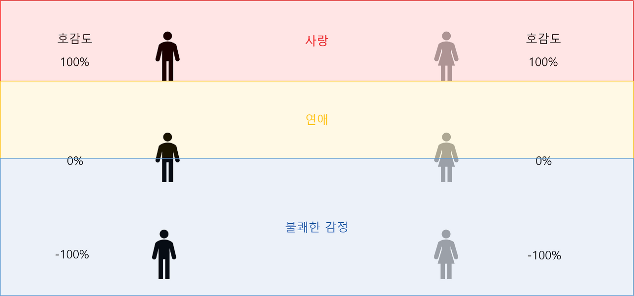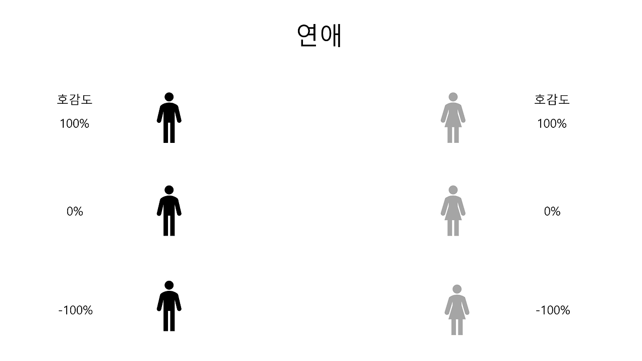 내가 생각한 연애 시장은 그렇다. 여기에서 호감도가 100% 100%이면 사랑인 거고 나는 서로 1% 이상만 돼도 연애는 가능하다고 본다.