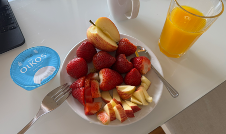 어제 장본 요거트, 딸기, 사과, 기계가 짜준 오렌지 쥬스.