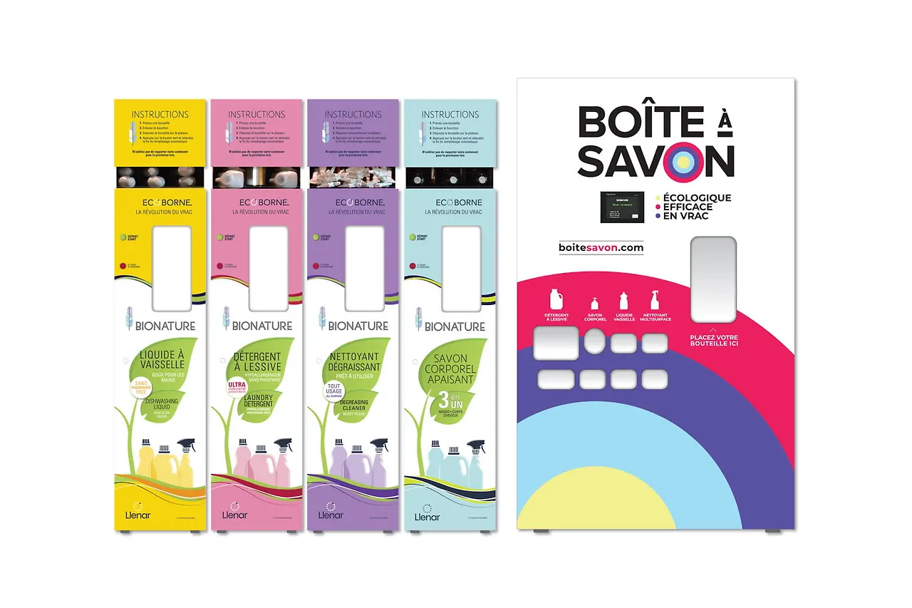 : 이는 우리나라에서도 한참 유행했는데, 친환경 소재 리필 서비스이다. 식품, 세제, 화장품 등의 리필 서비스로 소비자가 공병을 가지고 직접 제품을 구매하고 충전하는 형식이다. 퀘벡주 스타트업인 'ECOBORNE'는 친환경 세제와 비누 등의 세정 제품 리필이 가능한 자동판매기 형식의 리필 스테이션을 운영하고 있다. 이로 인해 지금까지 2만 5천여 개 이상의 플라스틱 용기 사용량을 절감했다.