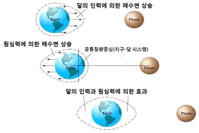 달과 가장 가까운 곳뿐만 아니라, 그 반대 방향인 곳도 부풀어 오르게 되는 이유는 '원심력' 때문이다. 원심력은 쉽게 말하면 회전 놀이기구를 탈 때 몸이 바깥쪽으로 밀려 나가는 느낌이다. 만약 통에 물을 넣고 매우 빨리 돌리면 통에 있던 물이 밖으로 흐르지 않지만, 천천히 돌리면 물이 출렁이게 된다. 그 출렁임이 바닷물의 출렁임이라고 생각하면 된다. 지구와 천체의 공통 질량 중심의 회전으로 인해 원심력이 발생하는데, 이로 인해 달 반대편 지구에서 바닷물이 부풀어 오른다.