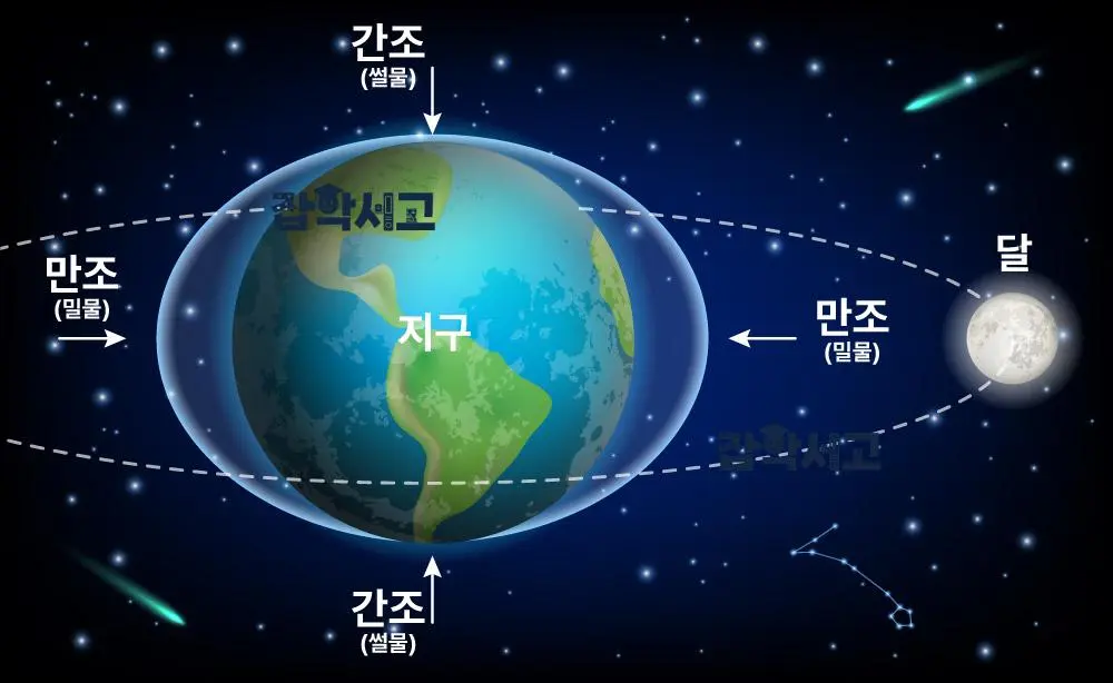 만조와 간조는 하루에 2번씩 나타난다. 지구가 하루에 한 번 자전하는 동안 지구와 달이 마주 보는 쪽은 인력에 의해, 그리고 지구 반대쪽에는 원심력에 의해 바닷물이 모이게 되어 만조가 된다. 그리고 달과 지구가 직각을 이루는 쪽에는 바닷물이 빠져나가 간조가 된다. 중위도에 속하는 우리나라는 지구가 자전하면서 밀물과 썰물이 하루에 2회씩 발생하는 것이다.