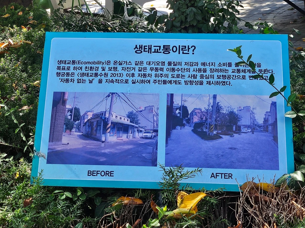 기후 위기 속 도시를 지속 가능하게 만들기 위해선 교통의 전환이 필요하다. 이에 수원 행궁동은 10여 년 전, 한 달 동안 자동차 없이 사는 실험을 진행했다. 교통을 운송수단인 transportation에서 mobility로 재정의하며, '사람' 중심의 이동을 강조했다. 이러한 에코 모빌리티(생태교통)를 통해 온실가스 배출을 줄이고 자전거, 보조보행기, 대중교통 시스템을 우선시하는 교통체계를 구축했다.