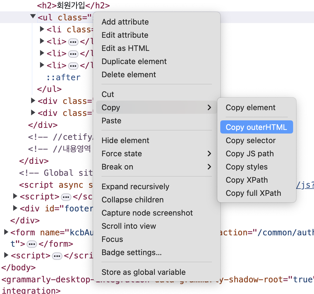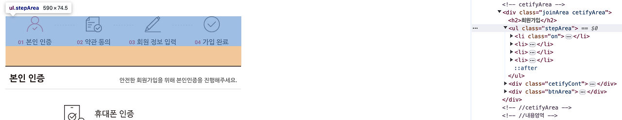 그림 6은 타사의 회원가입 화면 중 인디케이터 부분입니다. 크롬 개발자도구(단축키 F12)를 이용하여 요소 선택 툴(Ctrl(Command)+Shit+C)을 이용한다면 원하는 부분의 소스를 확인할 수 있습니다.