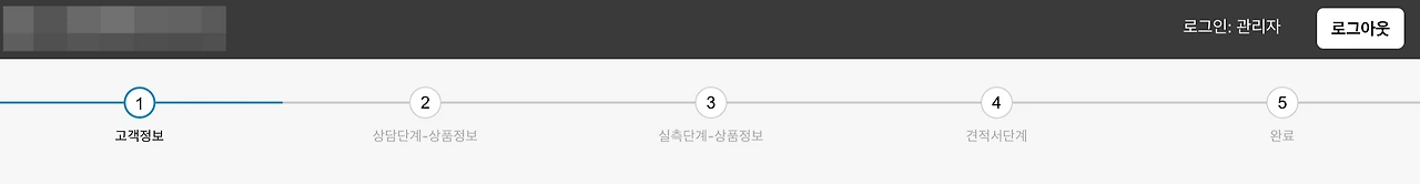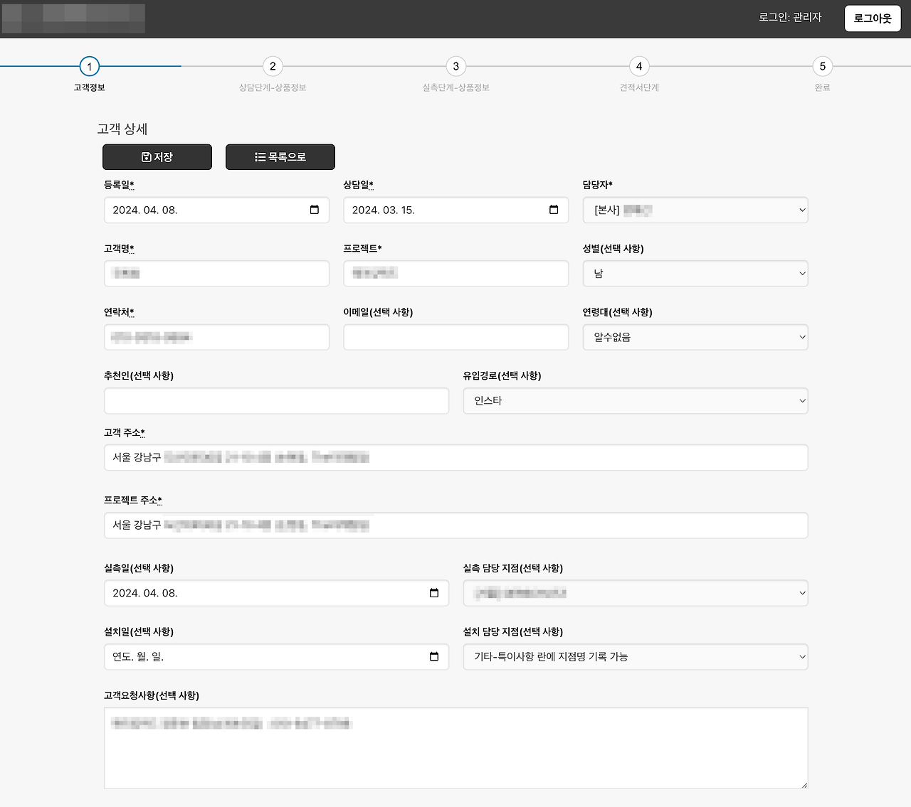 위의 그림 1. 프로젝트 상세화면의 구조를 살펴보면 상단의 헤더¹(로고, 로그인:관리자, 로그아웃버튼)와 인디케이터(1 고객정보, 2 상담단계-상품정보)를 제외하고 바디²부분에는 10줄의 Row로 필드들이 정렬되어 있습니다. 각각의 Row에는 용도에 따라 저장, 목록으로 버튼이 들어가 있고 등록일, 상담일, 담당자와 같은 필드들이 있는 Row에는 3 Column으로 구성되어 있습니다.