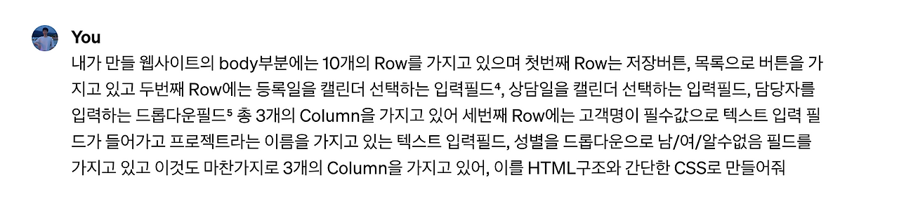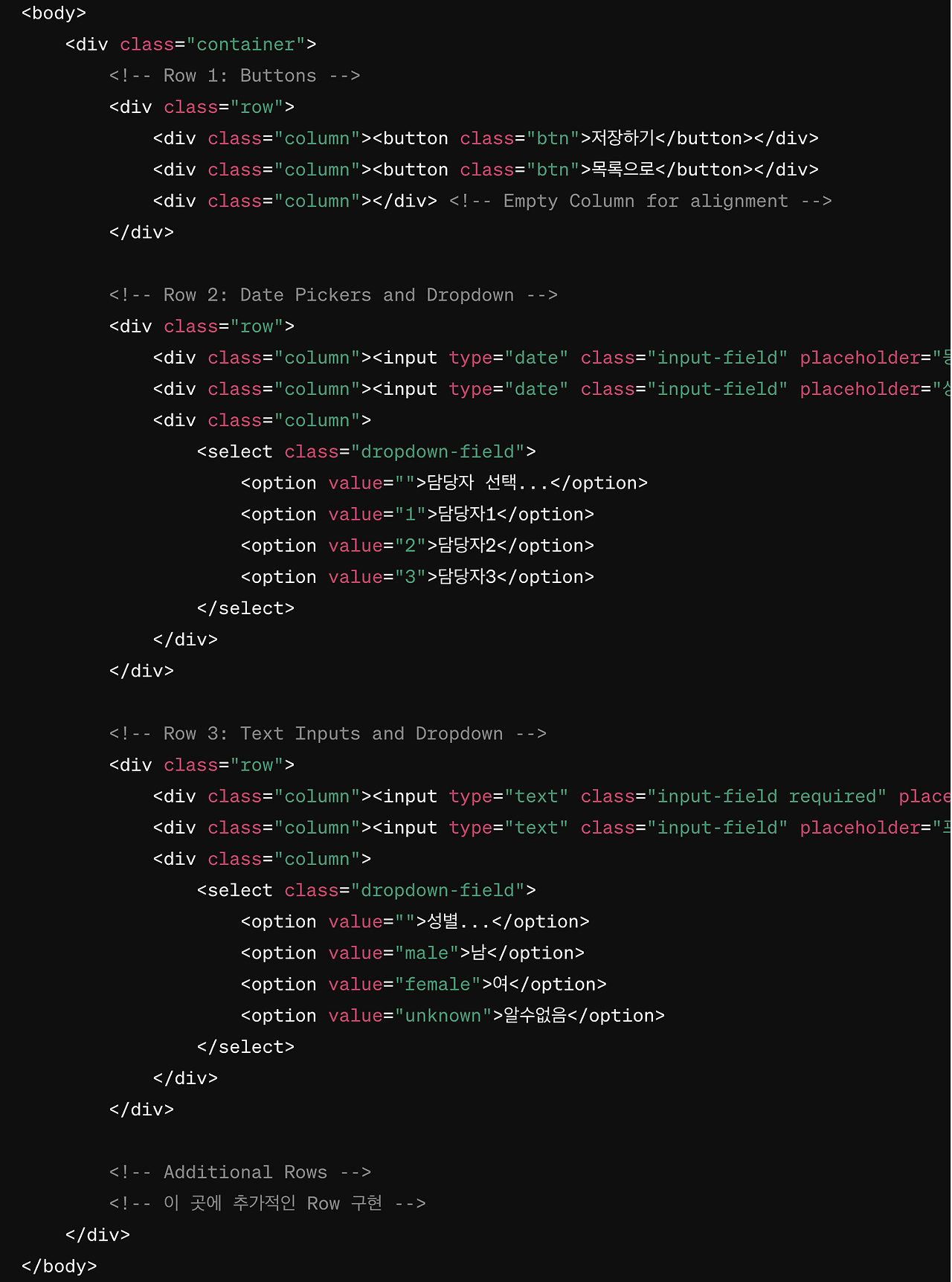 "내가 만들 웹사이트의 body부분에는 10개의 Row를 가지고 있으며 첫 번째 Row는 저장버튼, 목록으로 버튼을 가지고 있고 두 번째 Row에는 등록일을 캘린더 선택하는 입력필드³, 상담일을 캘린더 선택하는 입력필드, 담당자를 입력하는 드롭다운필드⁴ 총 3개의 Column을 가지고 있어 세 번째 Row에는 고객명이 필수값으로 텍스트 입력 필드가 들어가고 프로젝트라는 이름을 가지고 있는 텍스트 입력필드, 성별을 드롭다운으로 남/여/알 수 없음 필드를 가지고 있고 이것도 마찬가지로 3개의 Column을 가지고 있어, 이를 HTML구조⁵와 간단한 CSS⁶로 만들어줘"