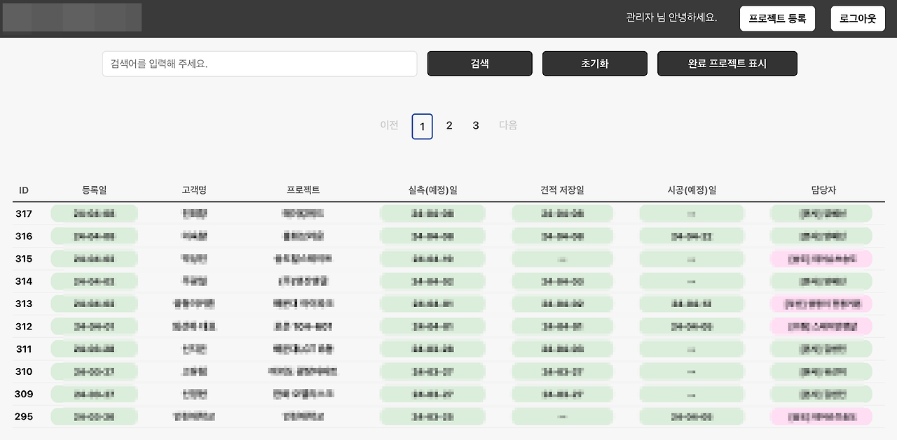 고객정보, 프로젝트 정보 등이 나열된 관리자 화면