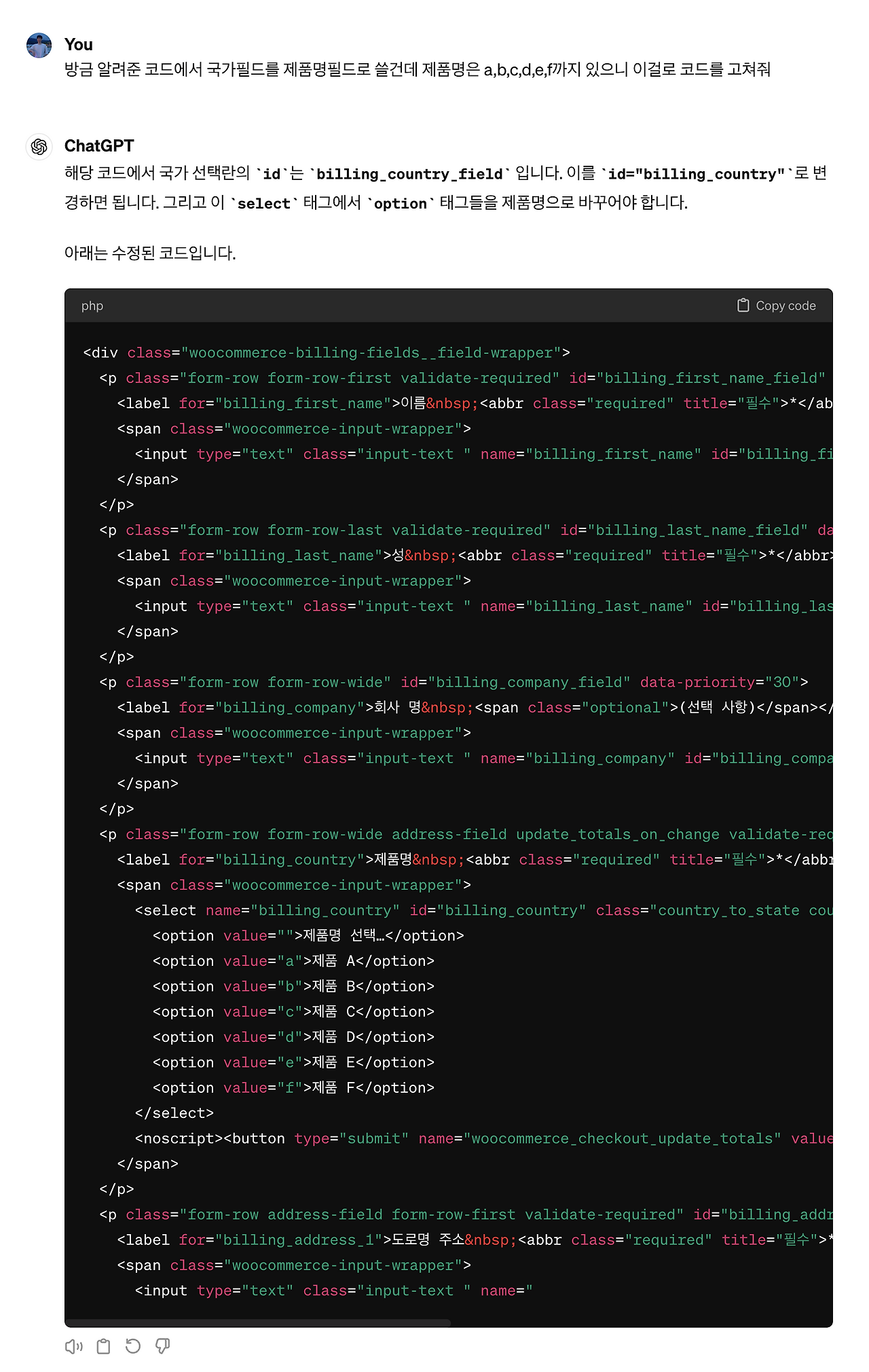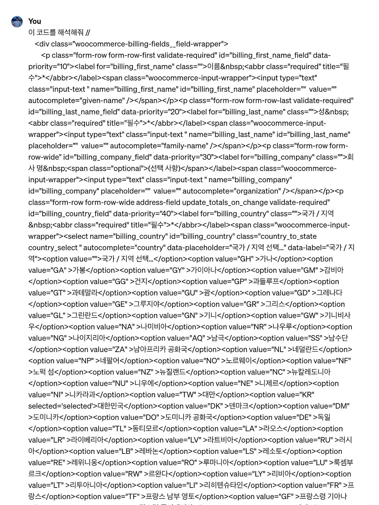 그림3) 해외 웹사이트 나라 선택 필드 코드 해석본