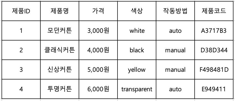 제품 A부터 F까지 상품 목록이 바뀌어져 있습니다. 이제 이를 DB와 연결하면 됩니다. DB에 있는 제품의 정보를 위의 코드에 넣기 위해서 우리는 먼저 DB와 테이블의 구조를 알아야 합니다.