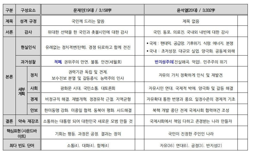 둘째, 추측-의지-가능성을 뜻하는 선어말어미 ‘-겠-’이 없습니다. 정확히 말하자면 ‘전혀’ 없는 건 아닙니다. 북한문제를 언급하며 “대화의 문을 열어놓겠다”, “담대한 계획을 준비하겠다”고 2회 언급했고, 취임사를 마무리하며 “국제사회에서 존경받는 나라를 만들어 나가겠다”고 말했습니다. 하지만 대통령 취임사가 일종의 약속과 다짐, 그리고 미래에 대한 국가운영 청사진이라는 점을 고려할 때, 이는 지나치게 적은 수준입니다. 박근혜 대통령은 첫째, 둘째, 셋째를 일일이 짚어가며 약속의 표현인 ‘-겠-’을 17회 사용했고, 문재인 대통령은 65회 사용했습니다.