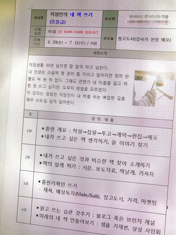 수요일 11시 20분, 노트북을 챙겨 바쁘게 내려갑니다. 김밥을 우걱우걱 씹으며 어젯밤 준비한 강의안을 옮겨 담습니다. 25명이 정원인데, 56명이 신청을 해서 분반을 해야 하나 어쩌나 고민할 정도였습니다. 2대 1의 경쟁을 뚫고 당당하게 선발된 수강생들의 얼굴을 하나하나 살펴봅니다. ‘도대체 뭘 믿고 오신 걸까’ 그만큼 책쓰기가 직장인들 사이에 화두가 되고 있다는 생각을 합니다. 어쩌면, 회사 내에 ‘스피치라이터’가 있는 게 신기해서 그럴지도 모릅니다. 원래 제가 하는 일은, 그림자처럼 있는 듯 없어야 하는 것인데 너무 나서는 거 아닌가 조금 걱정이 됩니다.