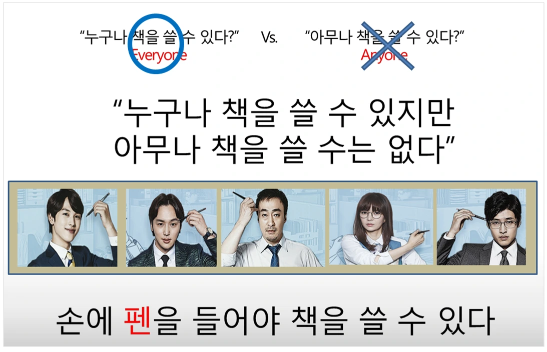 강의가 진행되면서 점차 모든 눈과 귀가 저에게 모이고 있다는 걸 느꼈습니다. 기운 센 천하장사가 된 것 같은 착각이 듭니다. 무대에 오른 아이돌 그룹이 이런 기분일까요. “그러면 저도 책을 쓸 수 있다는 말인가요?” 웅크리고 있던 한 수강생이 말을 꺼냅니다. “그럼요, 누구나(Everyone) 쓸 수 있어요. 아무나(Anyone) 쓰진 못하지만요.” 이게 뭔 소리인가 하시는 분들도 계시고, 단번에 그 차이를 짚어내는 분도 있으십니다. 모두에겐 가능성이 담겨 있지만, 그걸 꺼내는 사람은 결국 손에 펜을 든 사람이라고 설명해드립니다.