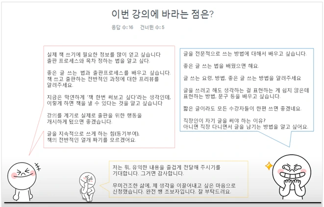 설문조사 리뷰를 하고 나니 15분이 지났습니다. 5분 더 거저먹은 셈이죠. 판에 박힌 이론을 내가 막 발견한 것처럼 말하는 건 민망한 일입니다. 인터넷만 뒤져도 나오는 출판 프로세스를 소개하는 것도 그렇죠. 그 대신 자신들이 적어낸 이야기를 풀어서 해주니 더 좋아하시는 것 같습니다. 꽉 막힌 표정이 이제야 스르륵 풀립니다. 책 쓰기에 필요한 정보를 많이 얻고 싶다고 하셨는데, 그건 제 이야기를 들려드리면 될 것 같습니다. 글 잘 쓰는 방법을 배우고 싶다는 분에게는, 그걸 알게 되면 저에게도 꼭 가르쳐달라고 부탁 드려 놨습니다.