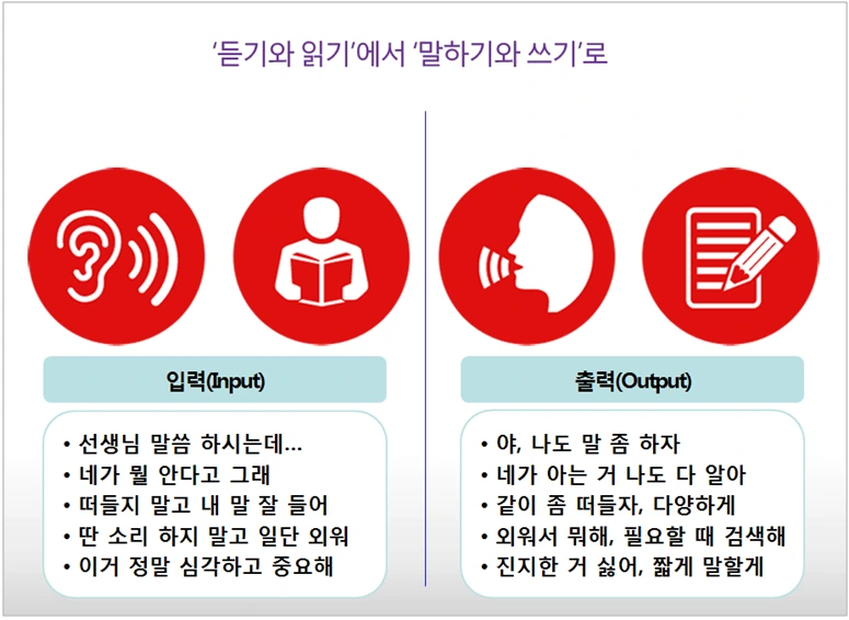 강원국 작가는 적극적으로 나를 표현하는 삶의 자세를 ‘출력(出力)’이라고 부릅니다. 지금까진 남의 말을 잘 듣고 생각을 읽는 ‘입력(入力)’을 잘 해야 성공할 수 있었지만, 이제부턴 전혀 달라진다고 말합니다. 맞아요. 앞으로는 내 생각과 내 감정, 내 이야기를 내 방식대로 말 하고 쓸 줄 아는 사람이 성공합니다. 입력보다 출력이 더 중요해집니다. 그걸 못하면 나란 존재는 ‘있어도 없는(I am, but none.)’것과 다를 게 없어요. 출력을 해야 내 자신으로 살 수 있고, 어제의 나보다 더 나은 존재로 나아갈 수 있습니다.