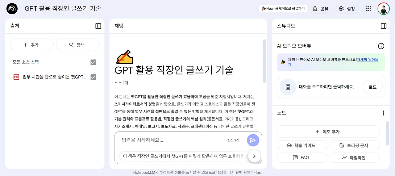 제가 직접 《업무시간을 반으로 줄이는 챗GPT 글쓰기》 PDF를 노트북LM에 업로드했더니, 단 5분 만에 남녀 2명의 진행자가 책 내용을 자세히 토론하는 자연스러운 팟캐스트가 완성되었습니다. 기계음이 아닌 생생한 대화였고, 숨소리까지 살아있는 퀄리티였습니다. 이 순간 저는 글쓰기의 새로운 가능성을 발견했습니다.
