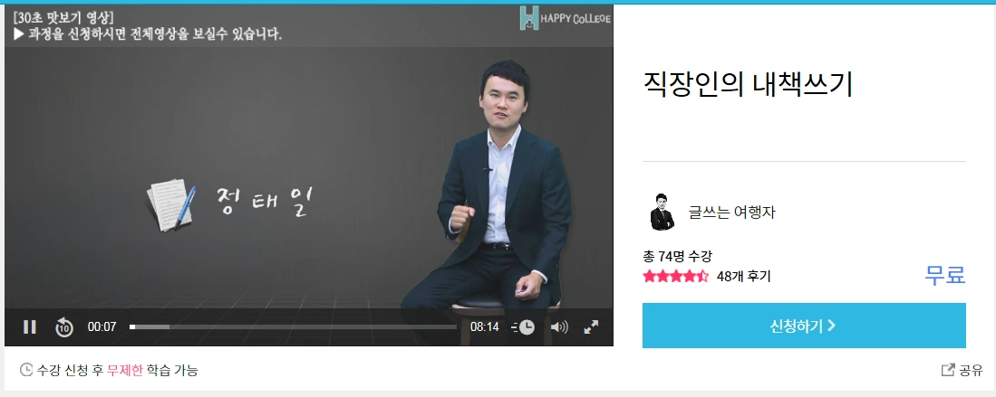 1. 교육전문기업 휴넷이 오픈한 ‘해피칼리지’에서 직장인 강사 10인에 선발되었습니다. 11월 중에 촬영을 마치고, 12월부터 본격적으로 강좌를 오픈할 생각입니다. 조금 기대해주세요. 고맙습니다.