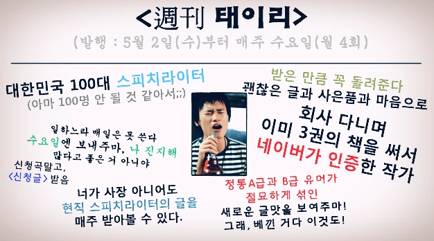 1. <週刊 태이리>는 <月刊 윤종신>의 오마주와 <日刊 이슬아>의 패러디, 그 중간 어디쯤에 있습니다. 하지만 그 어느 것과도 비슷해지지 않을 겁니다. 응원해주셔서 고맙습니다.