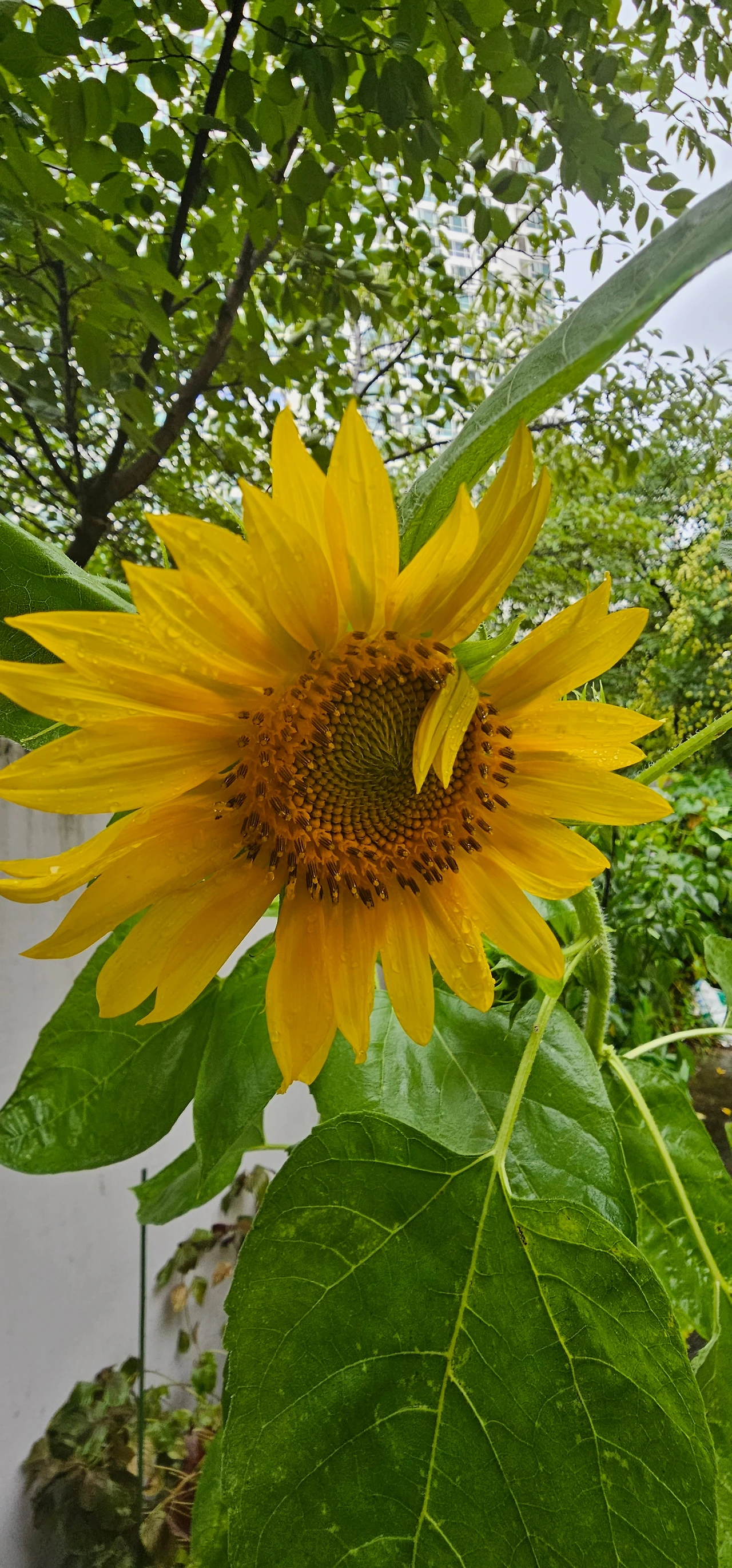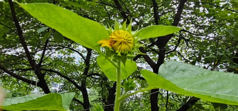 다음 날 두 잎 빼고 다 핀 해바라기, 위 해바라기와 아래 해바라기가 하루 차이로 이렇게 달라졌어요.