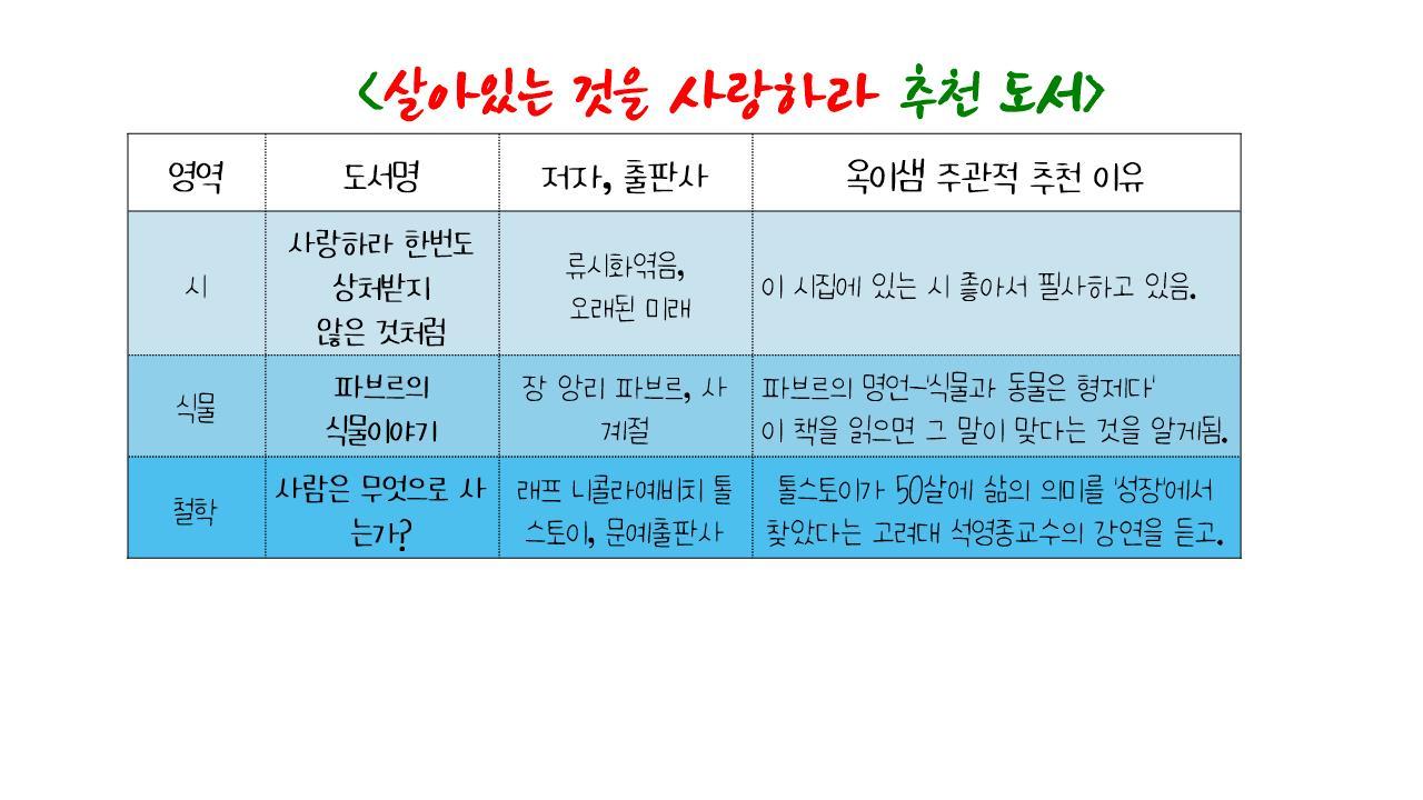 아침 독서활동 시간에 2장씩 나눠서 읽었다. 식물과 동물이 사람과 한 형제라는 것을 알게 해 준 책이었다. 식물도감과도 같았던 식물들의 이야기를 깊이 있게 이해할 수 있는 책이다. 이 책 읽고 학교숲 체험시간에 발표를 어찌나 잘하던지~ 점이 면을 만나는 순간이었다. 책 읽고 알게 된 것을 생활 속에서 다시 마주칠 때 깨달음의 기쁨을 느낀다.