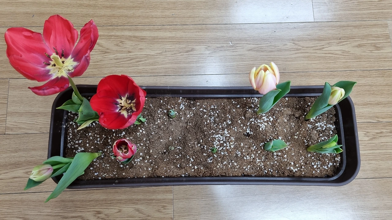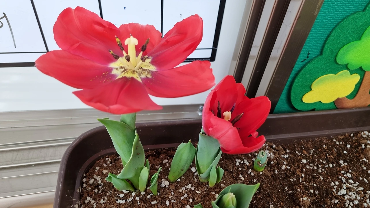 3월 -꽃과 사랑에 빠진 남편이 준 구근과 새싹을 얻어다가 교실에 두었다. 하얀색, 빨간색, 노란색 튤립 구근을 2주간 관찰하면서 ‘쿵푸’라 이름 짓고 쿵푸의 하루하루를 그림과 글로 그렸다.