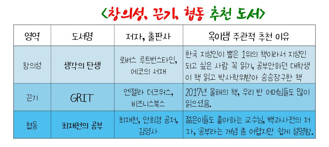 추석 연휴 동안 저는 MBC PD 김민식의 『매일 아침 글쓰기를 써봤니?』을 읽었습니다. 그 책 내용 중 이범 선생님의 ‘우리 아이, 미래형 인재로 키워라’ 영상에서 미래형 인재의 3대 조건(창의성, 역량, 협업 정신)을 보고 무척 공감했습니다. 선생님의 키워드를 초등학생 용어로 바꾸면 <창의성·끈기·협동 정신>이 됩니다.