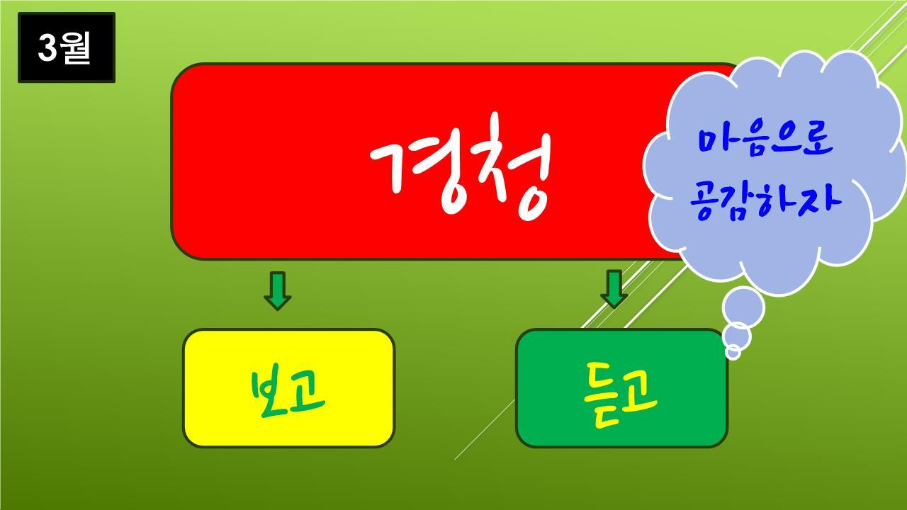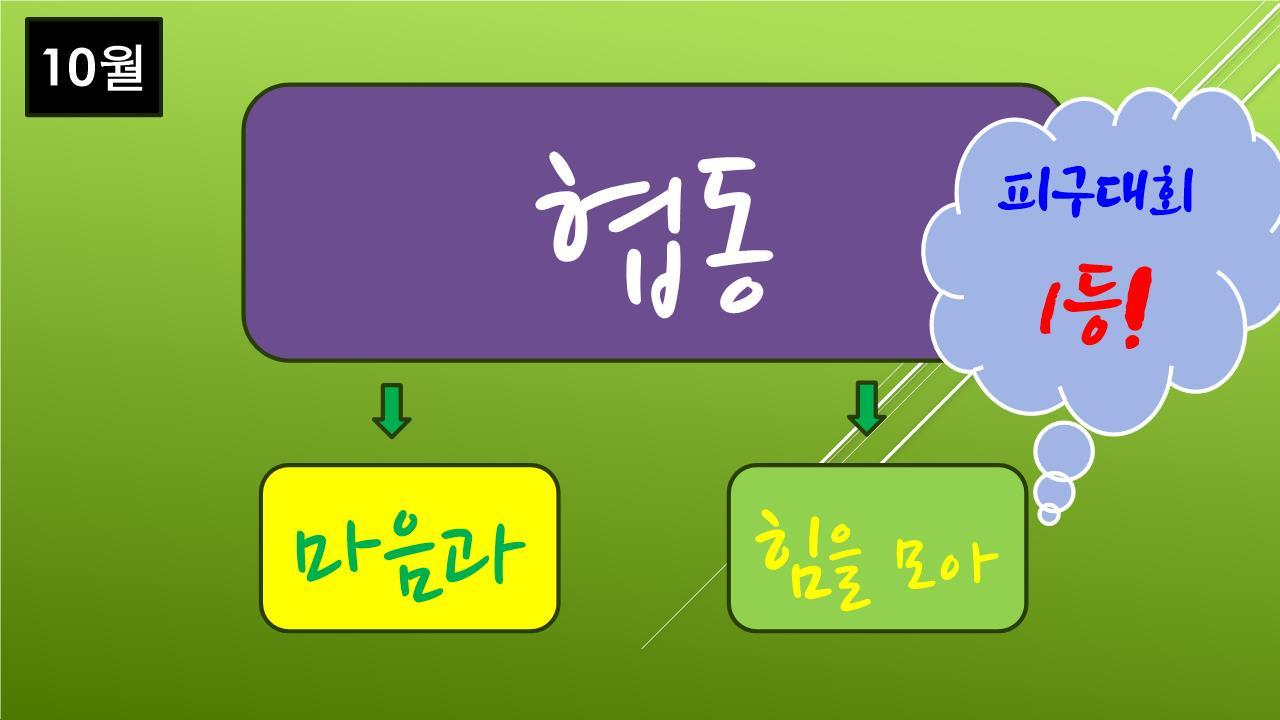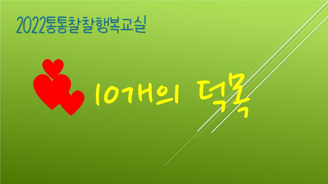 3월 전문적 학습 공동체 시간('전학공'이라 줄여 부름. 학년 별 연수인데 보통 연간 15시간을 함께 해야 연수시간으로 인정되어 전학공하는 날은 조퇴도 하면 안 됨)에 선생님들과 회의를 통해 방학을 제외한 10개월 10 덕목을 만들었습니다.