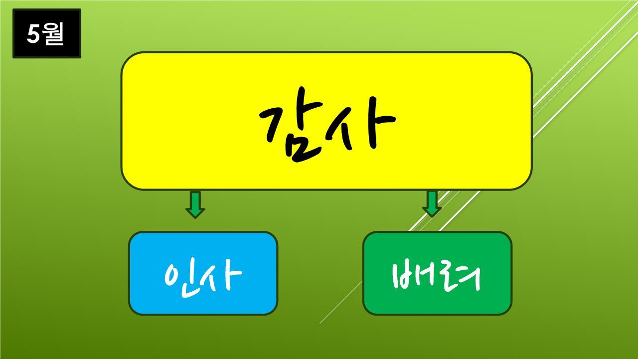 감사편지만 형식적으로 쓰는 5월이 아니라 감사는 '내가 켠 것 내가 끄기'와 같이 다른 사람에 대한 작은 배려로 시작된다는 것을 배우고 익히는 5월:감사의 달이다.