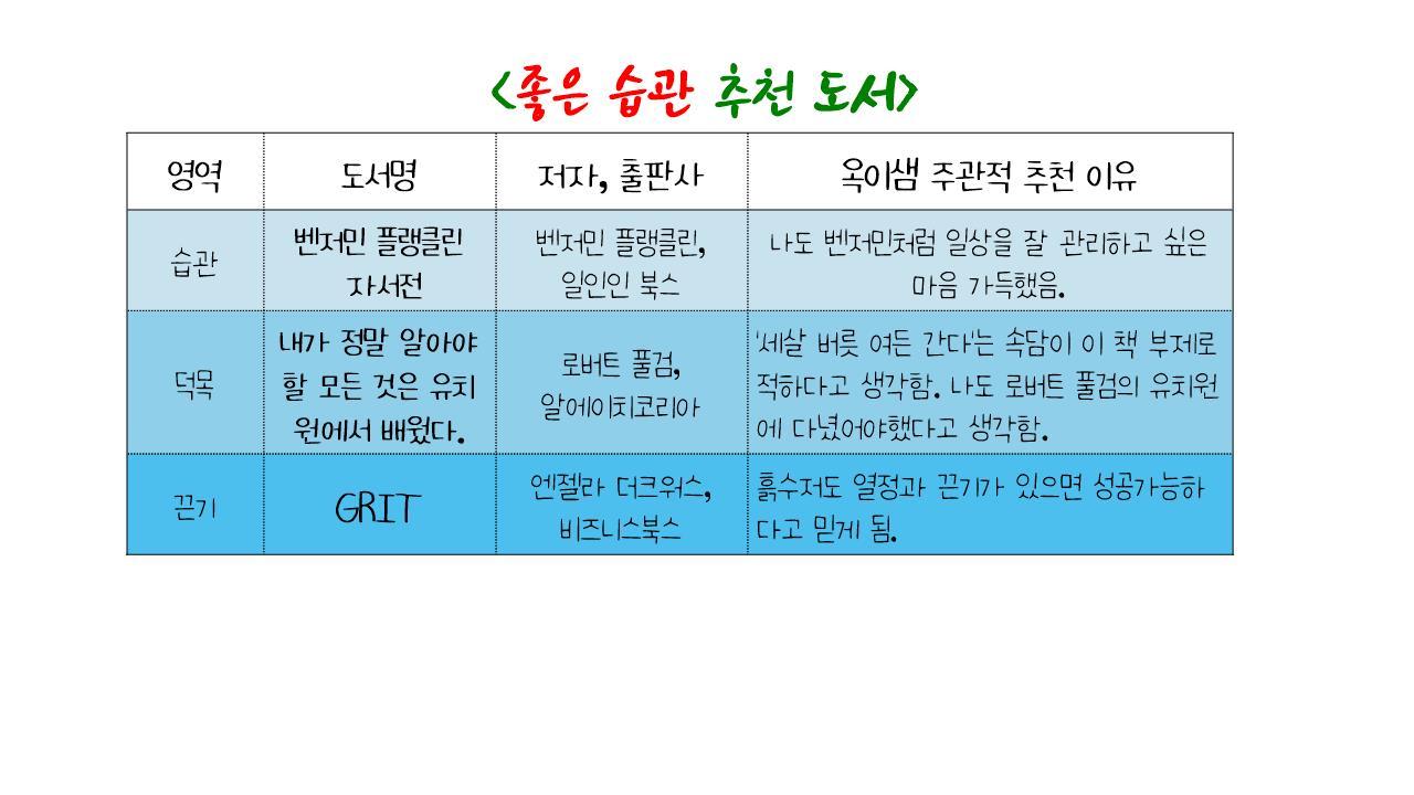 나폴레온 힐, 빌 하틀리 공저 <생각하라 그리고 부자가 되리라>를 읽고 우리 반 아이들도 꿈을 생각하면 이루어지겠다는 생각을 했다. MBC 김민식 PD님은 책 <매일 아침 써봤니?>에서 하나뿐인 딸에게 유산으로 '책, 사람, 여행'을 주고 싶다고 했다.