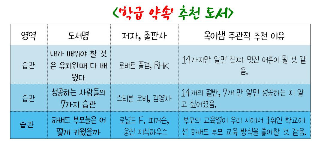 저는 아이들과 학급 약속을 세울 때 10여 권의 책들을 비교한 끝에 저자 로버트 폴검, 알에치코리아의 『내가 정말 알아야 할 모든 것을 유치원에서 배웠다』와 김영사에서 출판한 스티븐 코비의『성공하는 사람들의 7가지 습관』을 참고해 약속의 방향을 잡았습니다.