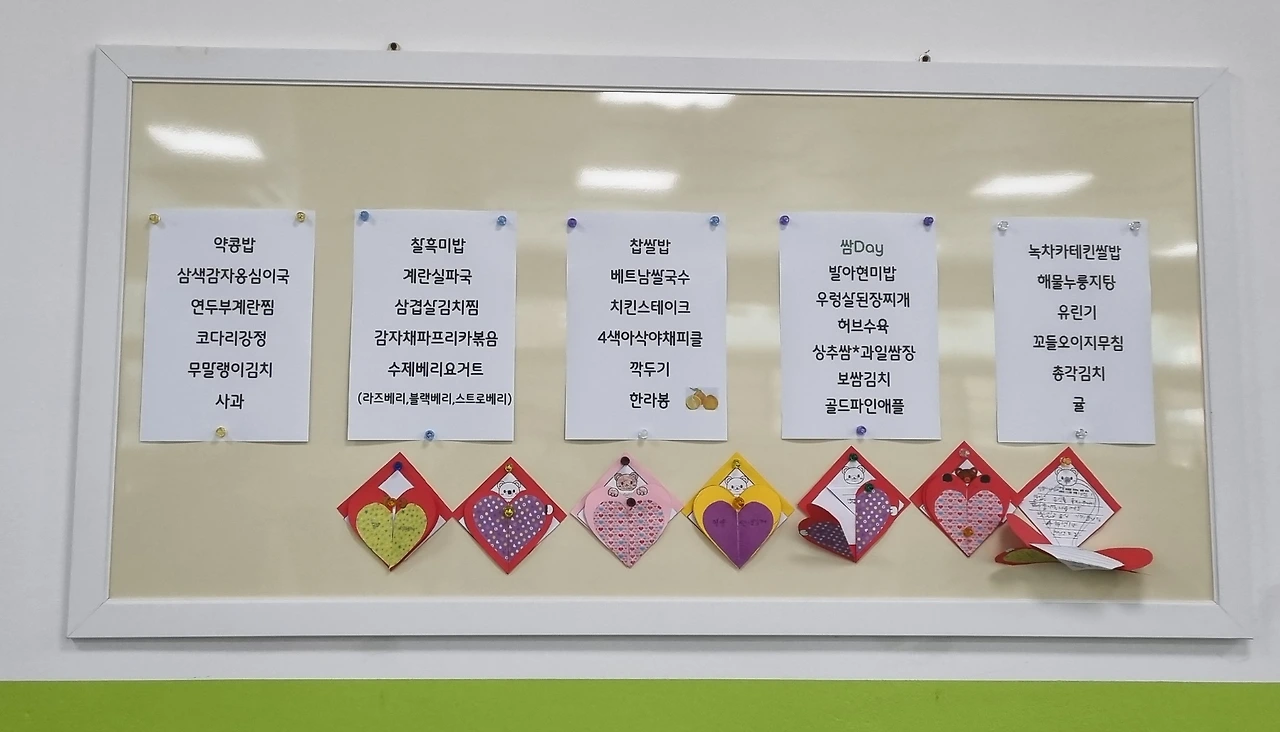 점심시간에 급식실에 우리가 가자, 예쁜 하트에 쓴 마음을 전하는 편지를 영양사 선생님이 급식실