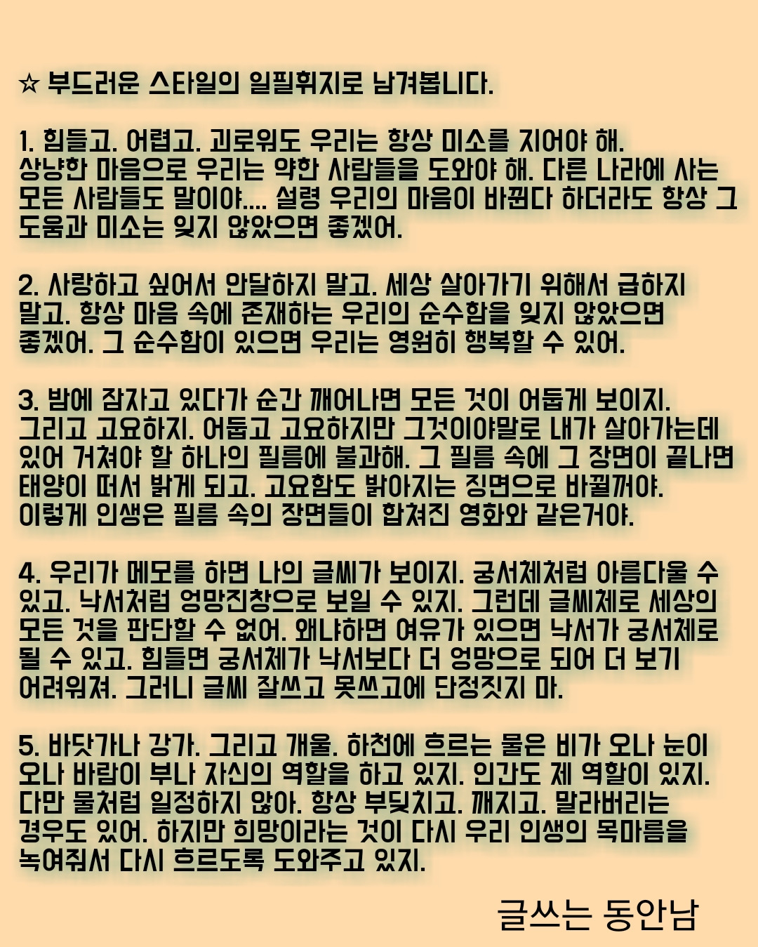 안녕하세요. 글쓰는 동안남입니다. 저는 네이버 블로그와 인스타그램에서 제가 쓰는 글들을 올리고 있습니다. 시. 수필. 스포츠. 추억. 음식 등 다양한 주제로 글을 적고 있습니다.
