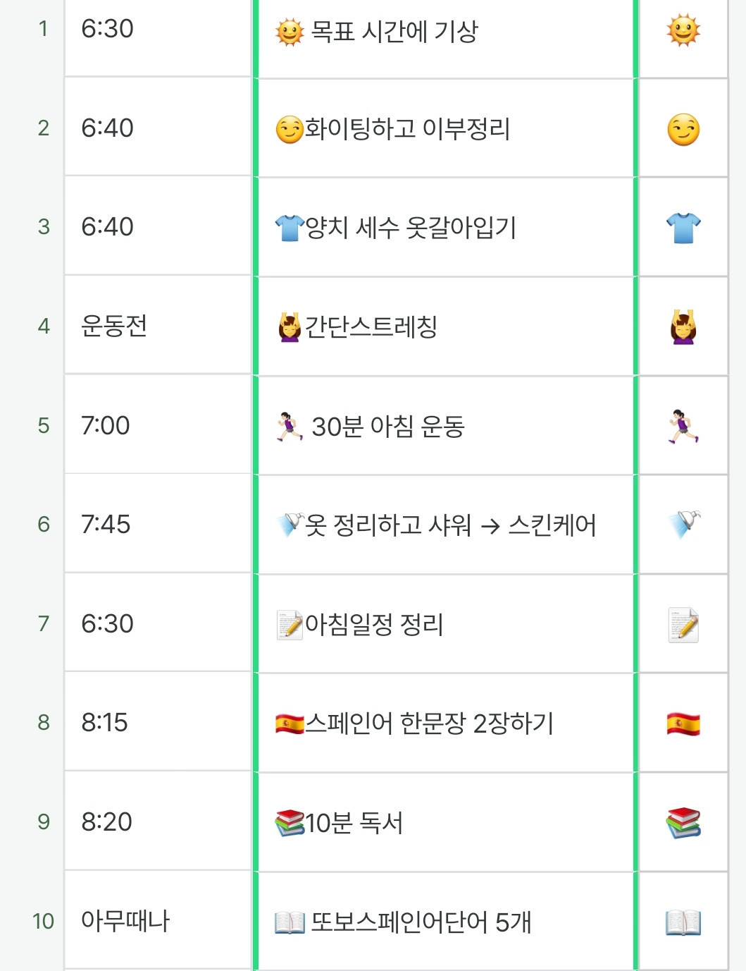 어려운 다이어트, 영어공부 등도 습관화하면 에너지가 들지 않는다. 그것의 책 <해빗>의 핵심이다. 습관은 의식적인 자아로부터 보내진 신호에 의해 시작되지만, 궁극적으로는 비의식적 자아에 의해 스스로 작동하게 된다고 한다. 한마디로 자동화된다는 것이다! 가벼운 루틴을 만들어보자. 루티너리나 마이루틴과 같은 습관 어플을 사용해 보는 것도 좋다. 위 사진은 내가 직접 설계하고 지킨 모닝루틴이다. 뭐가 많아 보이지만, 하나하나 자세히 보면 모두 가볍게 할 수 있는 것들이다. 나도 처음부터 이렇게 많은 것들을 하지 않았다. 처음에는 책이나 스페인어 1 챕터를 공부하는 것만으로 모닝루틴을 만들어갔다. 하나씩 익숙해지면 하나씩 추가했다. 부담 가지지 말고 나만의 데일리 루틴을 만들어보자.