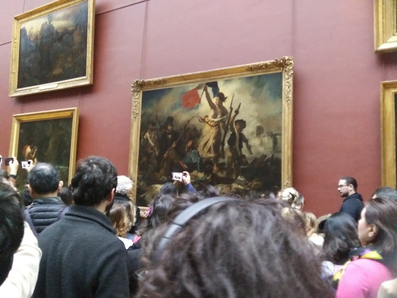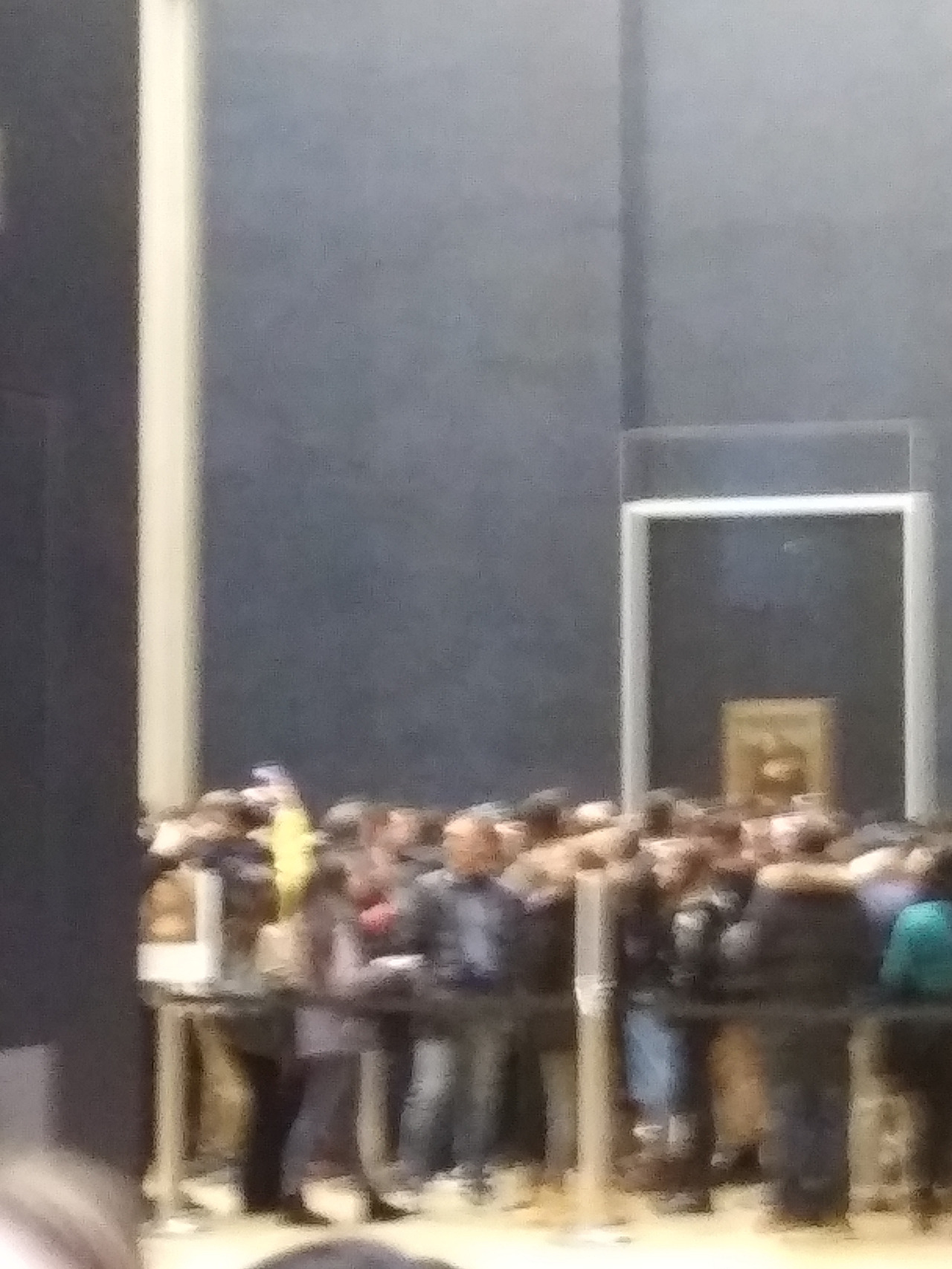 <모나리자 사진 앞에서 그림을 보고 있는 사람들 모습이다. 모나리자 그림 앞에서 제대로 서려면 2시간을 또 기다려야 해서 먼 발치서 까치발로 보고 사진 한 장 찍는 걸로 대신 했다. >